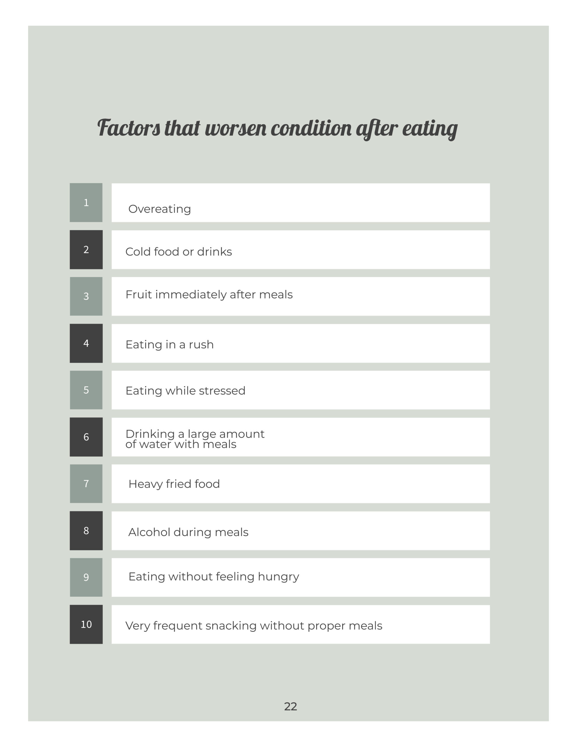 - Connects food, condition, and influencing factors into one readable context