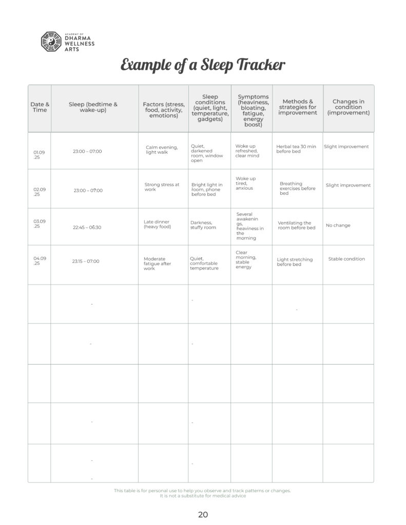 • A simple, structured format for tracking sleep quality and key nightly markers